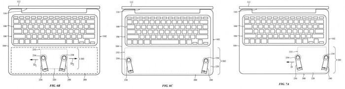 在周二美国专利商标局授予苹果的一项名为 "用于电子设备的动态输入面 "专利中,苹果提出了将目前的触控板完全去掉,转而将MacBook机身的整个下半部分变成一个大的触控板。苹果公司的理由是,巨大的触控面积可以为用户提供完美尺寸的触控板,而不是简单地提供一个大的输入区域。