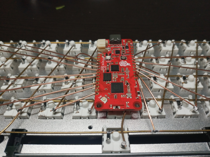 去掉键盘帽扣,作者用焊丝把关联按键连接起来,达到下图这样的效果。