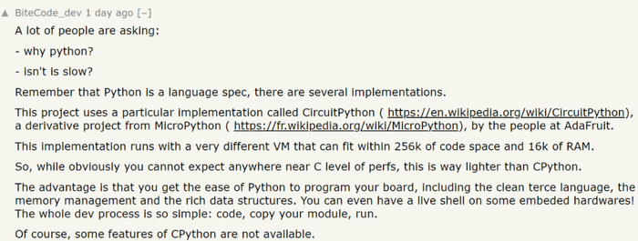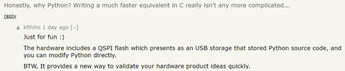 除此之外,也有人帮作者补充了使用 Python 的好处。ta 指出,这个项目用到的 CircuitPython 实现使用一个非常不同的 VM 运行,虽然不能指望它接近 C 的性能,但相比 Cpython 要轻量化得多。整个开发过程也会简单得多。