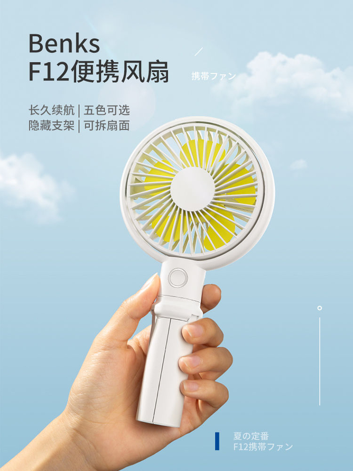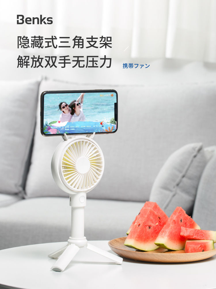 它可不只是一个手持小风扇,还自带隐藏三脚支架,能够随时变身成可调角度的桌面风扇。风扇上方还有一个隐藏彩蛋,打开即可成为手机支架,如果你的手机比较小的话,放在上面看视频还能顺便散热,一举两得。