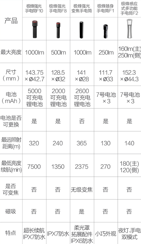 最新上架的极峰强光手电筒F10拥有1000lm亮度,支持IPX7级防水,5000mAh电池,5挡照明亮度,最长7500分钟续航。