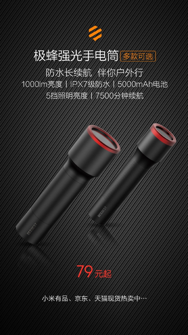 79元起 小米生态链极峰强光手电筒开卖:照射320米、续航7500分钟