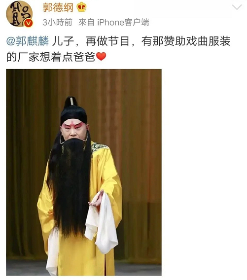 不光是综艺表现出色,郭麒麟的“商业价值”也被父亲郭德纲认证。录制完《拜托了冰箱》,他收获了腾讯视频送的会员卡,美团、饿了么也在线求送会员,郭德纲得知后,在微博上喊话,“儿子,再做节目,有那赞助戏曲服装的厂家想着点爸爸。”