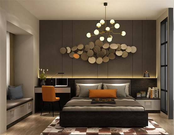 卧室背景护墙板设计,线条的勾勒,能拉伸纵向感,舒适柔和的床品,让卧室更显优雅气质。卧室一边电脑桌一边床头柜这种神搭配,充满现代韵味的,线条美的倾诉,配以精美大气的装饰和时尚灯饰,刻画出一幅精彩的作品。