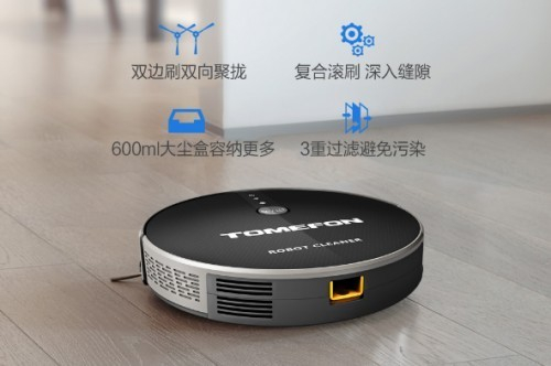 斐纳(TOMEFON)扫地机器人在扫地状态下,运用多种清扫组件,实现更高效率的清扫。数码无刷电机为其带来的澎湃吸力,以及大范围双边刷与滚刷,双向聚拢,深入清扫,可清除浮灰、碎屑甚至钢珠等垃圾,清洁效果可见一斑。