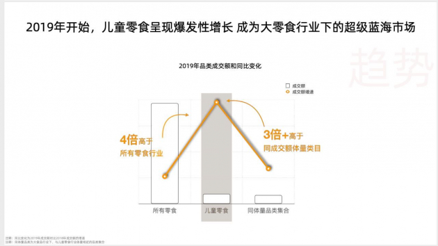 而来自天猫的数据显示,尽管目前线上儿童零食的生意占比相对较小,但增速显著——从2019年开始,儿童零食品类成交额的同比增速是大盘的四倍,呈爆发式增长。未来,儿童零食也将成为一个千亿市场。