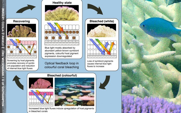 彩色的白化珊瑚被显示为打造其自己的光的“屏幕”,其允许内部蓝光的调节。这种新的保护由野生的、明亮的、“自然”的色调提供进而促进共生藻类的恢复。
