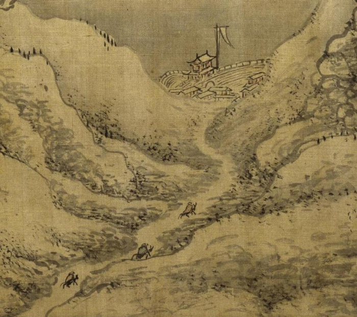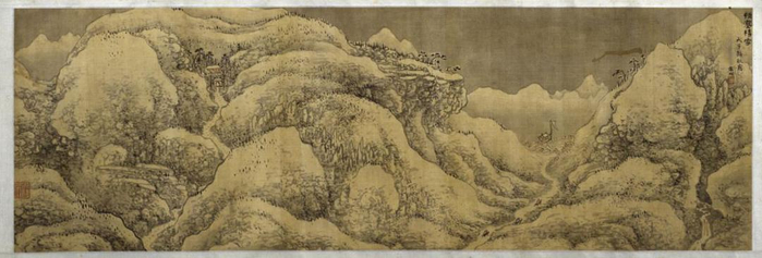 再看近处的山峰岩石。尽管面积很大,并且被白雪覆盖,但画家通过用墨色渲染山间的树林和建筑,以及没有被冬雪遮住的悬崖石壁,使得画面浓淡相间,层次分明。