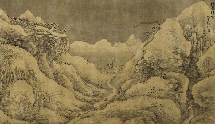 首先,画家在作品中运用了传统的平远构图法,虽然巨大的山峰在画面近处,但是一条蜿蜒的山路开辟了画卷中央的空间,将观者的视线以平视的角度延伸向远处的山峰和天空。