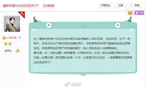 不过从网友晒出的截图来看,情况基本都是一致的,根据专业人士的初步排查应该是由于农历闰4月的日期导致旧版的锁屏APP出现了问题,最终导致整部手机系统崩溃。刚开始的时候,许多用户都想通过恢复出厂来解决,但是由于很多用户手机里面的资料没有备份,所以并不推荐用这个方法。有网友测试后发现,在手机开机之后,快速双击电源键,可以进入相机界面,这个时候可以阻止手机立即重启。在这个情况下下拉通知栏进入设置,然后把时间修改为一个月前,这样就能够暂时性的解决无限重启的问题。