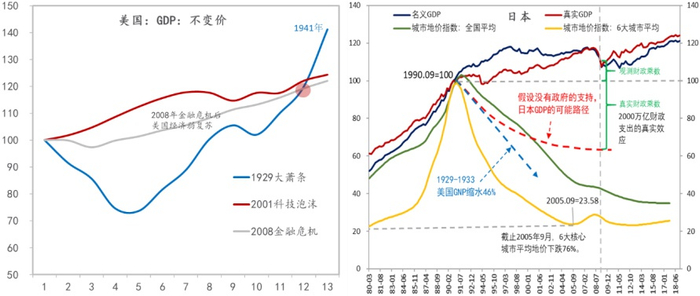 ),相比于大萧条,政策起到了托底的作用,而在大萧条期间,经济运行类似于自由落体运动,但出清之后却经历了强势复苏,二战形成了第二波刺激。将大萧条与2008年金融危机作比较,在危机发生之后的第12年,大萧条的复苏程度显著高于金融危机。类似的故事也发生在日本,1990年房地产泡沫破裂后,虽然房地产和股市价格大幅下滑,但GDP并未显著收缩(