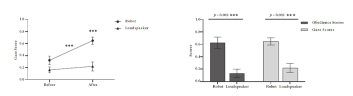 从下图就能看出,不论是宠物狗对眼前发号施令者的观察时间还是听从指令的次数,机器人的效果都明显优于扬声器。