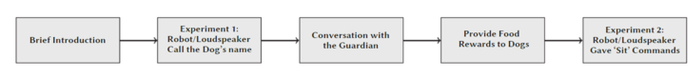 如下图,每个狗狗经历的实验流程大致是:在对测试环境做了简短的介绍后,机器人或扬声器叫出了狗的名字(声音完全一样),此时研究人员便在一旁观察狗是否有所反应。然后,机器人或扬声器将与狗主人开始交谈一会儿,试图在宠物狗面前提升存在感,随后为宠物狗提供一些小奖励,最后发出一声“坐下”的命令,研究人员也会密切观察狗狗此时是否会听话地坐下。