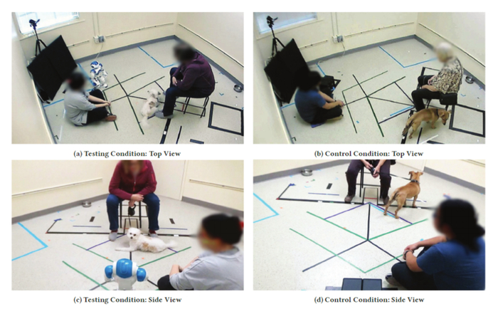34 只宠物狗(17 只为实验组、17 只为对照组)参与了实验,在实验的房间里,有研究人员、狗主人、机器人、扬声器,以及宠物狗。