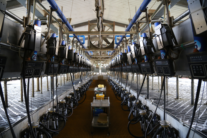 与此同时,乳制品智能生产系统上也体现出了满满的科技感。在产奶车间中,机器早已替代人工进行挤奶工作,只不过不同之处在于在机器挤奶之后,新希望乳业会采用低温速冷技术快速将牛奶温度降至2-3℃,保证牛奶在产出的第一时间就被妥善保存,避免了在储存和运输过程中滋生细菌,确保牛奶的优质与新鲜。