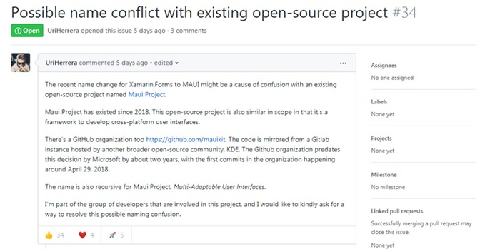Maui 团队的成员也前往 .NET MAUI 的 GitHub 仓库发表 issue 请求改名,微软员工 David Ortinau 刚开始在 issue 下面评论表示,此名称是 .NET Multi-platform App UI 的首字母缩写,并通过了法律审查,于是关闭了 issue。后来由于收到太多侮辱性的评论,他再次打开此 issue,将其设置为锁定状态。