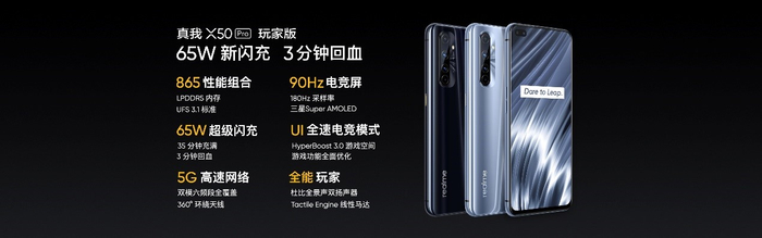 真我X50 Pro玩家版共有光速银”和“幻影黑”两个配色,搭载高通骁龙865和LPDDR 5,并首次搭载UFS 3.1。配备6.44英寸三星Super AMOLED显示屏,具有1100nit超高峰值亮度以及5000000:1的超高对比度,支持HDR 10+。支持90Hz高刷新率及180Hz触控采样率,同时配备65W SuperDart超级闪充,35分钟即可充满4200mAh大电池。