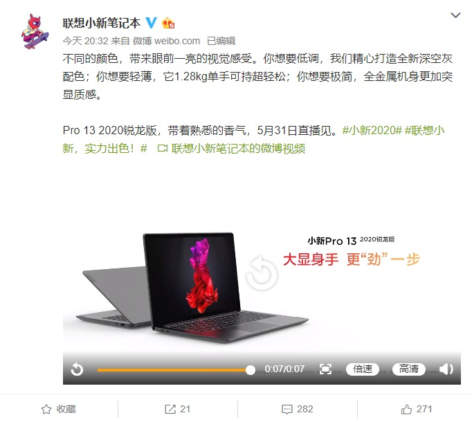 5月25日消息 根据联想小新官方微博的消息,小新Pro 13 2020锐龙版将在5月31日的直播活动中发布,采用了全新的深空灰配色。