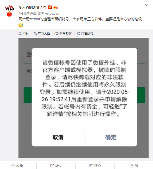 这次被打击的则是Wetool,据微博大V@今天WB倒闭了吗爆料,今晚使用这个工具软件的微信被大面积封号。