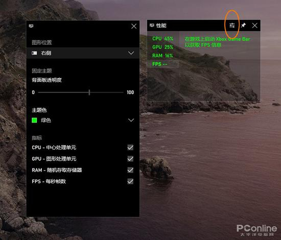 Xbox Bar默认会显示FPS、平均FPS、动态曲线三组参数,同时还有CPU、GPU、RAM等其他监测指标,用户可以通过点击面板右上方的设置按钮,手工调整这些监控项。包括监测指标、主题色、背板透明度等等都可以定义。