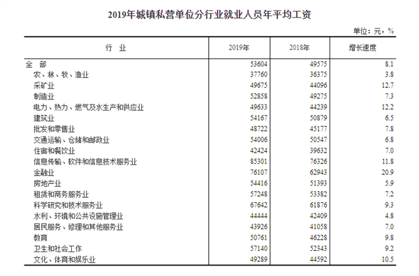 日前,国家统计局披露数据显示,2019年全国城镇非私营单位就业人员年平均工资为90501元,城镇私营单位(以下简称“私营单位”)就业人员年平均工资为53604元。以非私营单位为例,共有10个行业超过平均水平,6个行业年平均工资水平超过了10万元。