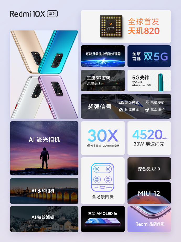 官方介绍,Redmi 10X全球首发天玑820,可能是2020年最强中高端处理器,由Redmi & MediaTek深度合作优化。Redmi 10X内置4520mAh电池,支持22.5W快充;Redmi 10X Pro则支持33W疾速闪充。