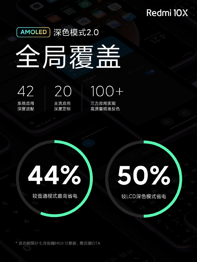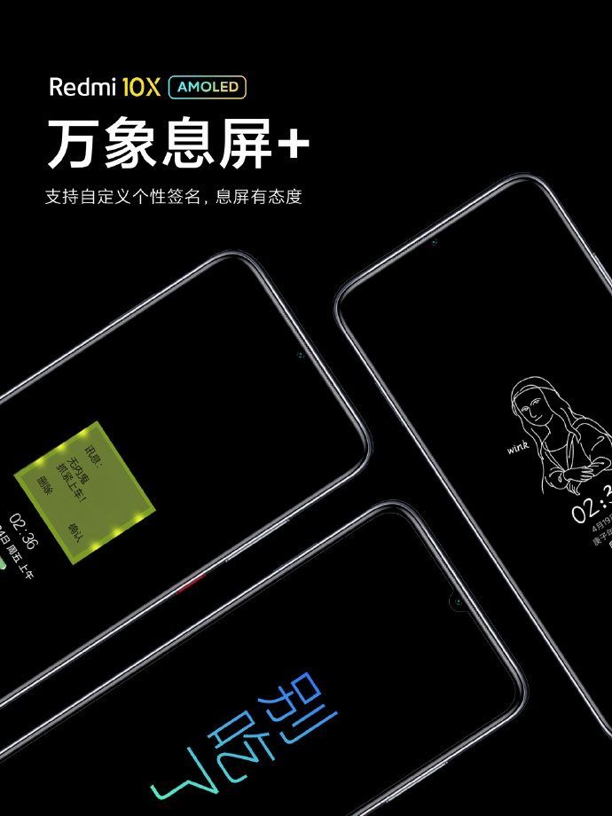 Redmi 10X采用三星AMOLED屏幕,支持屏幕指纹解锁,省电护眼且酷酷的深色模式,风格百变的万象息屏+超级壁纸+个性签名。