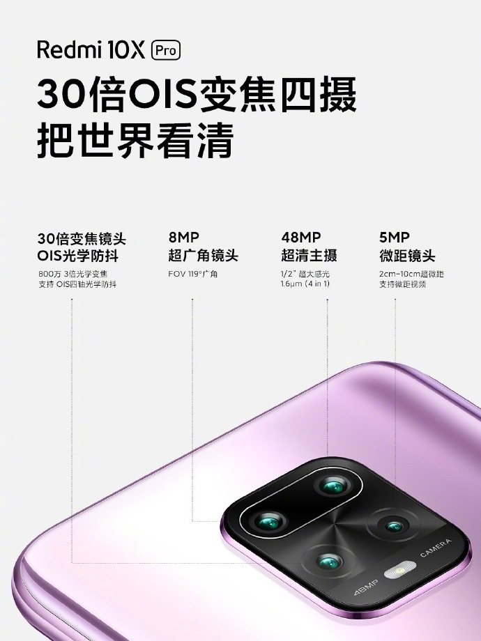 Redmi 10X Pro最高支持3倍光学变焦、30倍数码变焦、OIS四轴光学防抖。Redmi 10X Pro包括800万像素3倍光学变焦,800万像素超广角镜头,4800万像素超清主摄,500万微距镜头。