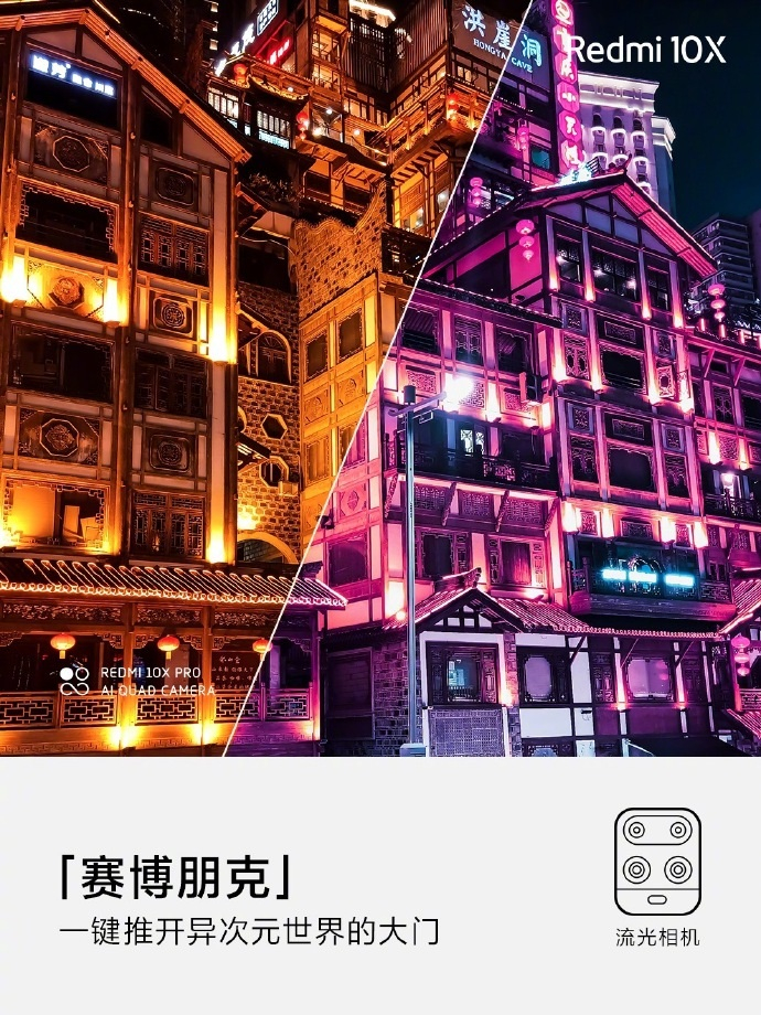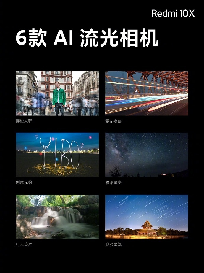 Redmi 10X支持流光相机,可以拍行云流水和创意光绘,也可以拍霓光夜幕和浪漫星轨,智能识别拍照场景的AI水印遇上魔幻现实的特效滤镜 AI算法的融入让每次拍照变得更有趣。