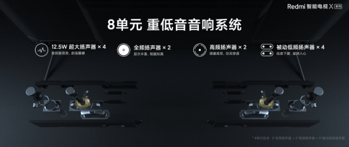 来一场沉浸放纵的观影感受,在旗舰级画质的加持下,必然需要一款好音质的音响系统。Redmi智能电视X系列全系配备了8单元的重低音音响系统,8单元的重低音音响系统为4个12.5W超大扬声器,能够覆盖更宽广的频响曲线,提供影院般音效享受,4个被动低频扬声器,低音下潜更浑厚震撼。其中2个全频扬声器和2个高频扬声器,呈现丰富的声音层次,声音细节表现真实自然。