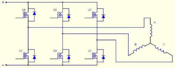 图中Q1到Q6为功率场效应管,当需要AB相导通时,只需要打开Q1,Q4管,而使其他管保持截止。此时,电流的流经途径为:正极→Q1→线圈A→绕组B→Q4→负极。MCU给Q1的栅极是PWM信号,而给Q4的栅极是常开信号,这样就可以通过控制Q1输入端的PWM信号占空比来控制驱动电机的有效电压。