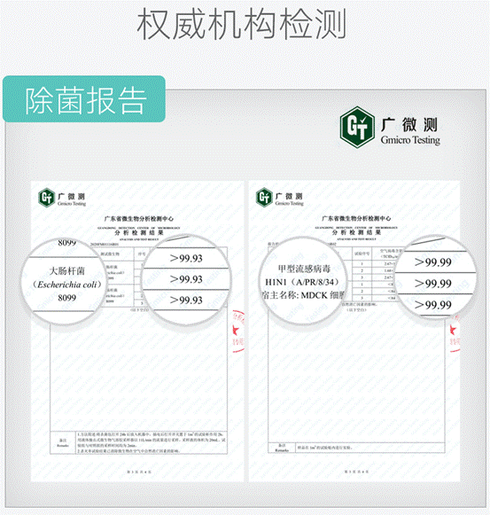 据专业机构实验证实,达氏Dustie DMF120空气消毒机可针对诸如大肠杆菌此类的菌种达到99.9%以上的除菌率,对于常见的甲型流感病毒、H1N1病毒等去除率可达到99.99%以上。