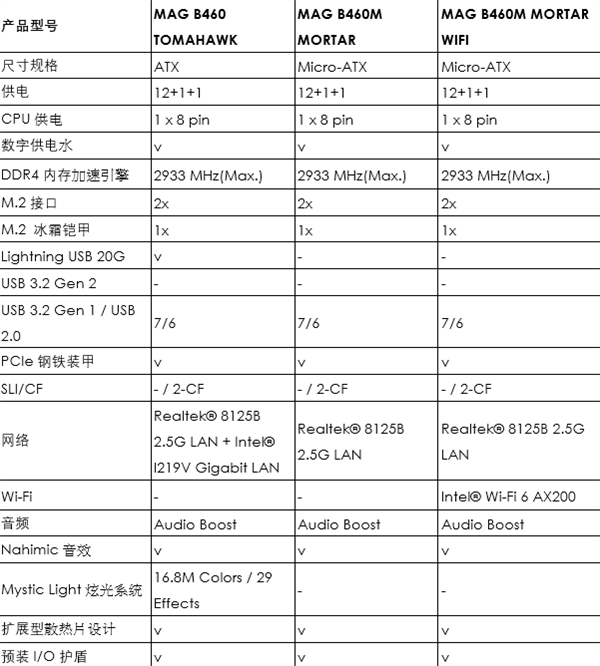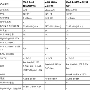 由于当前的英特尔第10代处理器将线程效率提高了一倍,因此与主流i5/i7处理器上的B460系列芯片组相匹配,这次在B460主板领域,微星一次发布了4种型号的MAG系列主板,其中包括MAG B460 TOMAHAWK ATX尺寸和三种mATX尺寸型号,包括MAG B460M MORTAR,MAG B460M MORTAR WIFI和MAG B460M BAZOOKA,为主流游戏玩家提供了丰富的选择余地。