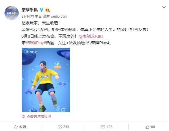 原标题:官宣:荣耀 Play4/Pro 5G 手机 6 月 3 日发布