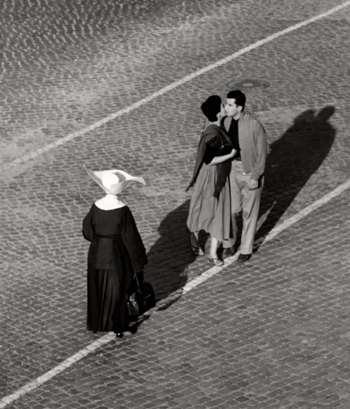 因此,难怪这批照片的配文都像是出自罗马短篇故事集里的标题,比如“小加里波第”、“擦伤的膝盖”、“连衣裙之舞”,还有“Giovanni给路人表演,想赚点买冰淇淋的零花钱”。