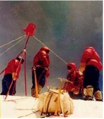 1975年中国测量队员首次登顶珠峰,红色三脚架即是觇CHAN标丨西藏自治区体育局