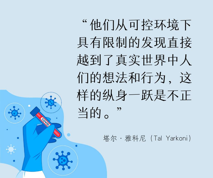 不过,尽管心理学家可以帮助大众缓解因新冠病毒出现的心理问题,但并不是所有人都觉得像特拉弗斯这样的心理学家在改善事态。确实,根据伦敦大学国王学院的心理学讲师斯图尔特·里奇(Stuart Ritchie)最近为英国网站UnHerd写的疫情分析,有些行为学家正在“给自己丢脸”,借心理学研究来贬低疫情的严重性。他说,“我们不应该用我们的研究,特别是那些小型的实验室研究,来给这如此严重、史无前例的事情下结论。”