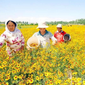 新疆南疆降水增多,对农业发展带来利好因素。图为岳普湖县农民在采摘雪菊。