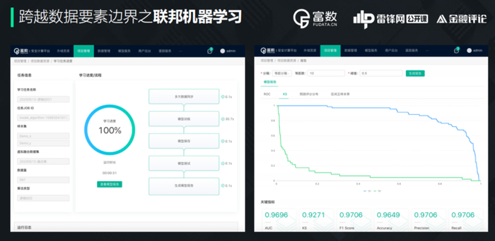 之后怎么合作?有一方创建合作的项目,对方有什么样的数据资源,是y变量还是x变量,横向还是纵向,都可以可视化创建合作项目,在合作项目中约定,之后就可以进行安全数据处理。虚拟融合就是安全对齐的过程,形成看上去是虚拟的样本集,实际上还是分布的。然后选一个联邦学习算法,在虚拟融合集上进行训练。