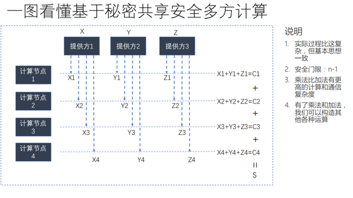 现在先理解切成多片,每一方也会拿到其他方的切片,拿到以后就在本地做计算,比如说x1+y1+z1,这就是一个加法,加起来形成新的等式。c1c2c3就属于中间结果,最后要求和,中间结果已经把各方的秘密混在一起了。