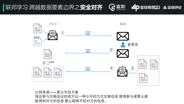 所以样本对齐有三个层次的安全:第一个,比较简单的盲签名的安全对齐,但不太公平。第二种是安全公平的交换,第三种要隐藏被匹配到模型中的ID。