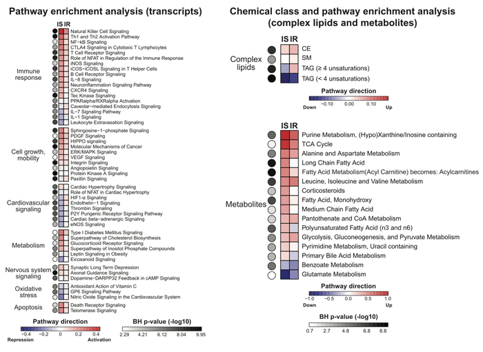 最终的结果是,胰岛素抵抗志愿者的免疫反应较弱,而且与修复相关的髓过氧化物酶增加也较弱。一些参与血管功能、对缺氧的反应和一氧化氮合成的一些心血管通路在胰岛素抵抗这体内受损