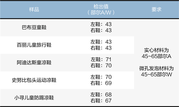 同样是使用性能方面的测试,阿迪达斯、史努比和小寻3款凉鞋硬度值超标,说人话就是鞋底材料太硬了,穿了不舒服,严重的还可能影响儿童骨骼发育。