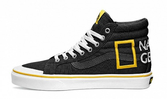 Sk8-Hi上方出现刺绣形态的“National Geographic”字样,经典黄框图案以立体刺绣的方式呈现在后跟,侧面帆布细看可见格纹,鞋头参考Style 138加入包胶头设计,水线和鞋舌标点缀黄色。