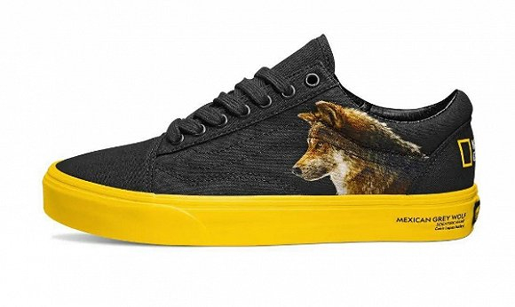 Old Skool的整个包边都是亮黄色,左右两脚鞋身四面分别印上东方鞭蛇、墨西哥灰狼、红颜树蛙、褐喉三趾树懒等珍稀动物图片,包边后侧印有他们的英文名和学名,以此向大众科普。