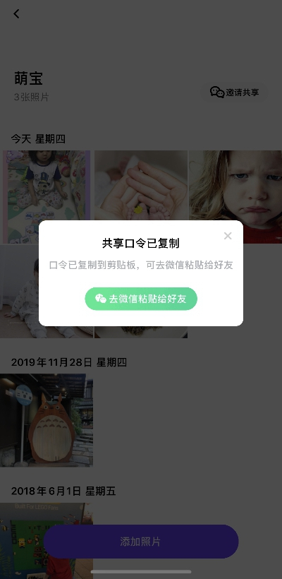 如今,只要合理利用一刻相册中的“相册共享”功能,这些烦扰都可轻松解决。宝妈们可由一人发起照片共享功能,将共享口令分享到宝妈群中,就可邀请一同出行的宝妈们实时上传小朋友的照片,方便快捷。