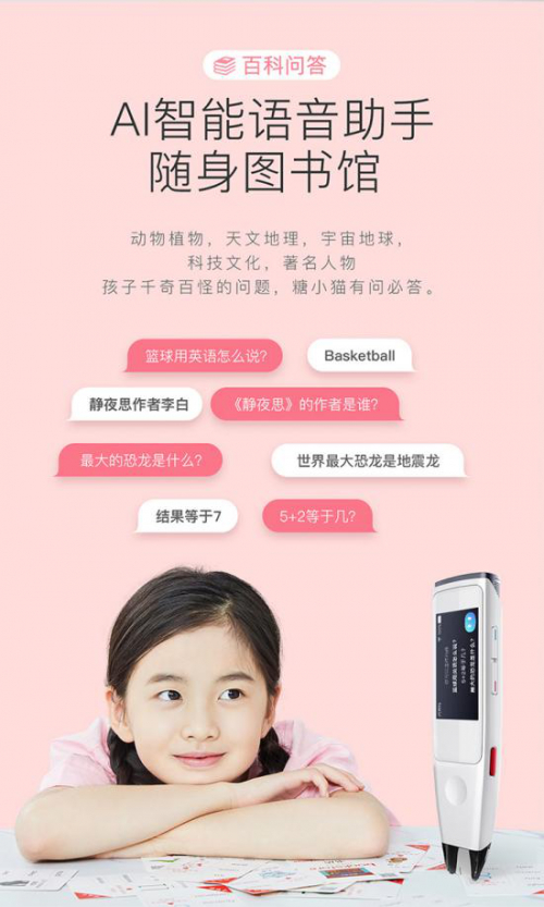 孩子的想象力天马行空,当头脑里出现一个问题,身边又没有纸可以扫的时候,只需张开口询问搜狗糖猫词典笔内置AI语音助手糖小猫,