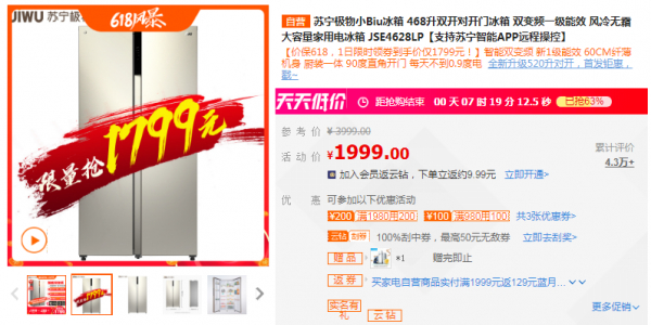 6月1日,今年618全面启动,苏宁发布618开门红战报,苏宁自主品牌小Biu系列智能家电表现亮眼,其中468L的小Biu对开门冰箱仅售1799元,重新定义行业坐标价,一举拿下同型号产品Top 1。