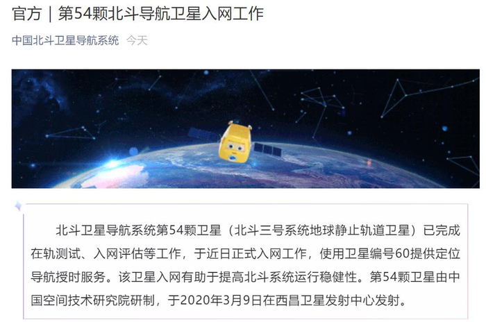 第54颗北斗导航卫星正式入网工作