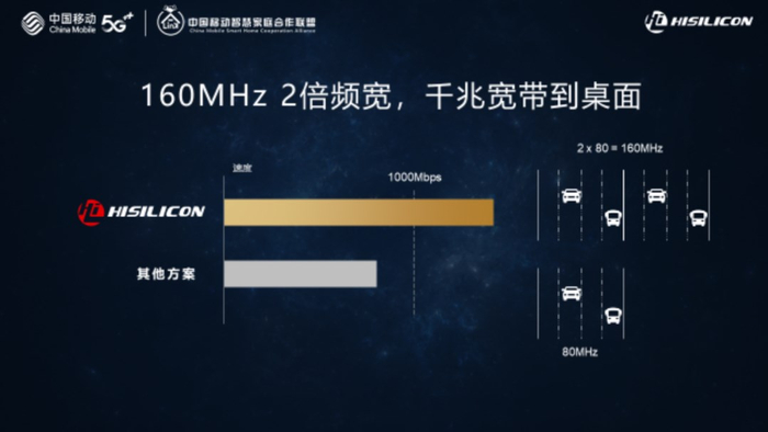 IT之家获悉,本次中国移动与上海海思联合定制的 Wi-Fi6 路由器在 5GHz 频段提供了 2 倍于 80MHz 的频宽,160MHz 的实测性能已超过 1Gbps、真正的支持移动千兆宽带到桌面的业务发展。
